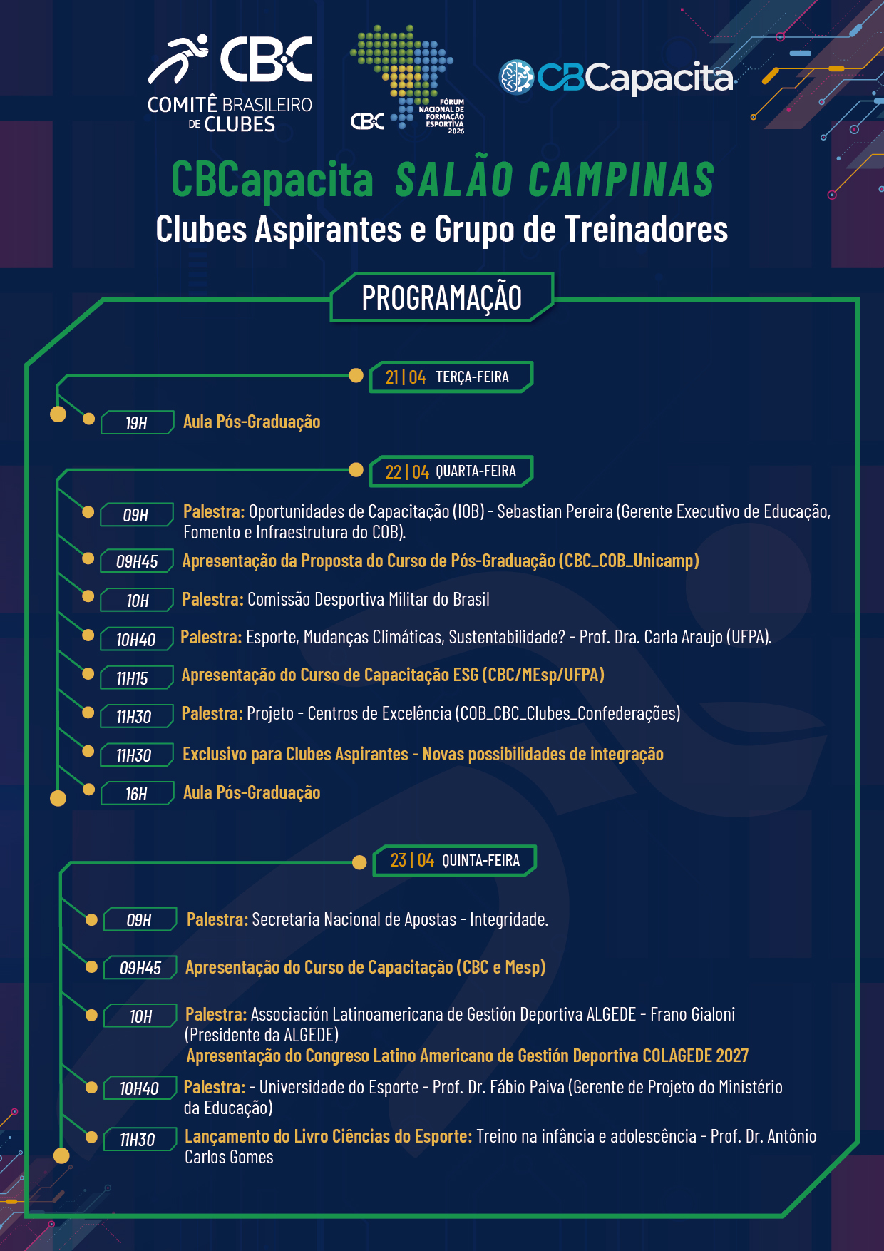 Também pela manhã, entre os dias 22 e 25 de abril, acontece o CBCapacita, iniciativa voltada à capacitação e qualificação dos profissionais que atuam diretamente na formação esportiva. A programação conta com o apoio de universidades renomadas, entidades parceiras do governo federal, e integrantes do Sistema Nacional do Esporte - Sinesp, e é dividida por públicos e períodos: nos dias 22 e 23/04, as atividades são destinadas aos representantes dos Clubes Aspirantes e Treinadores Esportivos; já nos dias 24 e 25/04, o foco é voltado aos Clubes Vinculados e ao segundo grupo dos Treinadores Esportivos.